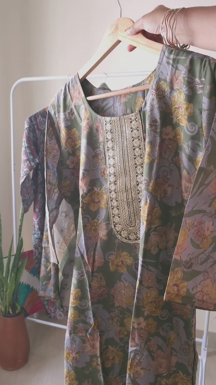 Ethnic Motifs Printed Pure Muslin Slitted Kurta With Trousers & Dupatta